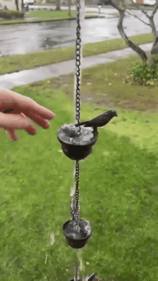 A: It’s both. It channels rainwater efficiently and also doubles as a hanging bird bath and wind chime when the weather is dry.